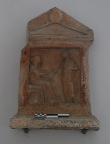 - NOTIZIE STORICO CRITICHE La stele era inizialmente conservata nel Giardino del Seminario della Salute a Venezia, ma non sono chiare le circostanze in cui vi giunse. Da un manoscritto del XVIII secolo, conservato nella Biblioteca Bodleiana di Oxford, si apprende che la stele, di cui viene riportata l'iscrizione, fu prelevata a Creta da F. Molino e che nel XVII si trovava a Venezia, nella casa del fratello Domenico. E' molto probabile che la stele provenga dall'isola di Delo, come sembrano indicare i dati epigrafici, nonché l'analisi iconografica e stilistica. L'identificazione della provenienza contribuisce a chiarire anche la cronologia del manufatto, poiché la maggior parte delle stele delie sono datate tra il 166 a.C., quando l'isola viene restituita agli Ateniesi, e il 69 a.C., anno del sacco dei pirati. A confermare una datazione compresa tra il II e il I sec. a.C. sono i caratteri epigrafici, in particolare l'utilizzo di lettere capitali con apici marcati e alfa con barra spezzata, nonché la menzione nel testo di un immigrato damasceno, a conferma del notevole flusso di commercianti di origine vicino-orientale che contribuirono in modo determinante allo sviluppo nell'isola in questo periodo. Alla medesima datazione rinviano anche alcuni particolari stilistici, come per esempio le proporzioni massicce delle figure, l'accentuazione del volume della testa e l'esecuzione frettolosa del panneggio. Tra il II e il I sec. a.C., in area greco-orientale, si assiste a una produzione di stele mediocre e corsiva, rispetto alla quale tuttavia il rilievo in esame denota una certa accuratezza nella resa dei particolari. Un confronto molto vicino sia per lo stile che per l'atteggiamento e il panneggio delle figure, è una stele con dexiosis conservata al Museo di Myconos.