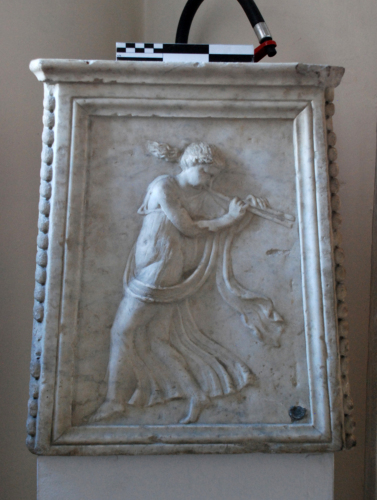 Base di candelabro di forma triangolare, modanata nella parte superiore con una gola rovescia. Ogni lato è profilato lungo gli spigoli da file di perline ovoidali e decorato con un riquadro centrale incorniciato da una semplice modanatura a listello e a gola rovescia, con una figura all'interno. In un lato, è raffigurato di profilo un Satiro barbuto, che incede verso sinistra mentre regge con la mano sinistra una pelle di pantera e con la destra un doppio tirso ornato al centro da un nastro. Nel secondo lato, è raffigurata una Menade che suona il doppio flauto; vestita con un chitone stretto sotto il seno e con un velo svolazzante, incede verso sinistra a passo di danza, con la testa rivolta all'indietro. Nel terzo lato, un'altra Menade, sempre con la testa rivolta all'indietro, avvolta in un chitone ripiegato sotto il seno, regge il timpano con la mano sinistra sollevata, mentre con la destra sostiene un lembo del velo svolazzante.