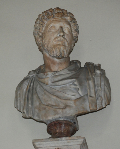 Busto con ritratto di Marco Aurelio in età avanzata, il cui volto è profondamente delineato da effetti chiaroscurali e coloristici, ottenuti con un vigoroso utilizzo del trapano, evidente soprattutto nella resa della capigliatura con ciocche corte e fitti ricci aggrovigliati, oltre che in quella della barba, divisa in varie ciocche leggermente contorte a spirale. Queste formano una massa compatta, in contrasto con le superfici levigate del volto, reso a larghi piani illuminati, la cui espressione, con lo sguardo assorto rivolto verso destra, rinvia alla concezione distacca della dottrina stoica adottata dall'imperatore filosofo. Il busto indossa il mantello fissato sul petto con una borchia all'altezza della soalla destra (paludamentum).