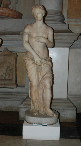 Statua di Afrodite pudica semipanneggiata, raffigurata stante sopra una base circolare, nell'atteggiamento di sfiorarsi delicatamente il seno con il braccio sinistro, mentre con l'altro trattiene all'altezza del bassoventre un panno che le ricopre le gambe, tra le quali si articolano sia le pieghe che cadono verticalmente verso la base, sia il lembo che, sormontando la gamba sinistra sopra il ginocchio, ricade con ricche frange, creando un dialogo tra la consistenza trasparente della veste e la tettonica del corpo sottostante. Il nudo del tronco è impostato verticalmente, secondo la medesima visione frontale della veste, anche se il torso, proteso leggermente in avanti, mostra un timido tentativo di movimento tortile, che però rimane bloccato. La testa, con una pettinatura a scriminatura mediana da cui si dipartono morbide ciocche raccolte in uno chignon sulla nuca, presenta uno schema ovale del volto, ottenuto a piani delicatamente sfumati e con un morbido modellato, reso tuttavia con una maggiore intensità contenutistica e pittorica.