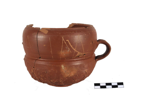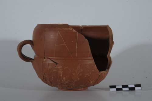 Coppa ad alto bordo convesso, tipo Sarius, con orlo rientrante, assottigliato, sottolineato da una scanalatura esterna, corpo emisferico, decorato a matrice, piede ad anello con fondo concavo, ansa a nastro con leggera costolatura centrale, impostata a metà del bordo e sulla spalla, subito sopra la fascia decorata, sul lato opposto, rimangono i due attacchi dell'altra ansa. Fascia decorata con una teoria di palmette, verticali, a 7 lobi, sorgenti da una foglia di edera; tra una palma e l'altra si alternano una grande foglia di quercia sorgente da un cespo di foglie, in alto, ai suoi lati, due rosette a sei petali, alternata ad un'aquila, ad ali spiegate con le zampe rivolte verso d. e la testa verso s., al di sotto, teoria di fiori a sette petali e coroncine. Sul bordo è graffito, dopo la cottura, con tratto poco profondo e sottile, il marchio a grandi lettere ATIM ATI. Marchio leggibile come Atimetus oppure Athimetus. Quest'ultimo è un vasaio attivo in area padana tra il 10 a.C. e il 15 d.C., cognomen di origine greca molto frequente in Italia a partire dalletà imperiale. La produzione di Athimetus si concentra nella Venetia (Altino, Aquileia, Concordia Sagittaria), con rare attestazioni in Aemilia, Transpadana e Noricum. Invece Atimeti è frequente per lo più in area polesana tra età augustea e inizio del II sec. d.C. L'argilla è di colore camoscio rosato, la vernice è rosso-arancio.