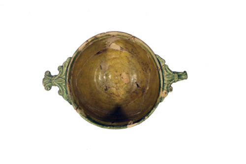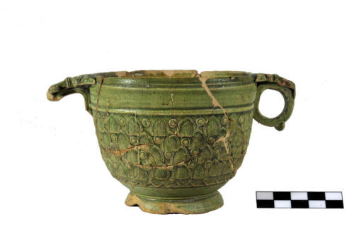 Coppa skyphoide biansata con corpo ovoide e profondo, orlo dritto sottolineato esternamente e internamente da due solcature, due anse verticali ad anello con solcatura centrale e con una linguetta sporgente nella parte inferiore, si congiungono allorlo con un attacco orizzontale formato da girali contrapposti, fermati al centro da una fascia e sormontati da una foglietta. Le anse sono impostate subito sotto lorlo e nella parte superiore del vaso, piede ad echino, incavato nella parte inferiore decorata a cerchi concentrici rilevati e sottolineato esternamente da una scanalatura. Parte centrale del corpo decorata a rilievo, tramite matrice, con quattro file orizzontali, parallele, di palmette con nervature incise alternate a cerchietti con umbone centrale; presso il piede è unaltra fila di cerchi e di semipalmette con punta allingiù. La fascia decorata è sottolineata in alto e in basso da solcature circolari incise. L'argilla è di colore rosato, il rivestimento è verde chiaro allesterno e giallo scuro allinterno.
