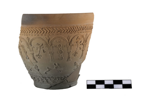 Bicchiere, tipo ACO, con corpo troncoconico a pareti appena ricurve, orlo assottigliato, fondo piano, distinto allesterno da scanalature concentriche, così da ottenere un piccolo piede ad anello. Decorazione sul corpo costituita da quattro registri: subito sotto l'orlo, giro di chiusura con corona di foglie entro cornice a cordicella, al di sotto è una serie di archi a doppia linea e a doppio ordine di colonnine a capitello composito, nell'imposta è un motivo vegetale; entro gli archi restano le lettere (punto) C (punto) A C[-]S (punto); sotto gli archi si alternano una fila di cinque cerchi, disposti verticalmente, dei quali tre, più grandi, costituiti da due cerchi concentrici e due, più piccoli, ad un solo cerchio, e un erote che salta verso d., sotto il suo piede d. sono tre cerchi, disposti a triangolo con vertice verso il basso; al di sotto della serie degli archi è una sequenza semplice di erote, cane, cervo nell'atto di correre verso d. e gallo verso s.; infine, in basso, in prossimità del piede è un motivo a cordicella inframezzate da spirali, in basso teoria di archetti desinenti in fiore gigliato. L'iscrizione, incompleta, fa riferimento all'officina di Aco, attivo nella valle del Po tra il 20 a.C. e il 10 d.C. Per l'integrazione della firma con il nomen del lavorante Diophanes vd. Mantovani. Il bicchiere è probabilmente uno scarto di produzione perché cotto male. L'argilla è di colore rosato, dura e compatta, la superficie va dal grigio più scuro al rosato.