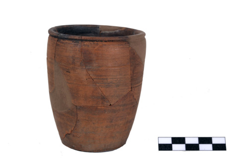 Bicchiere con corpo leggermente ovoide, piccolo orlo estroflesso, piatto superiormente e sottolineato da profonda gola esternamente, fondo piatto con traccia di arco inciso, sulla spalla scanalatura circolare e in basso tracce di cerchi concentrici incisi. L'argilla è di colore arancio pallido, l'ingobbio è bruno chiaro con tracce di annerimento da fuoco, superficie marrone, bruna, grigiastra per cattiva cottura.