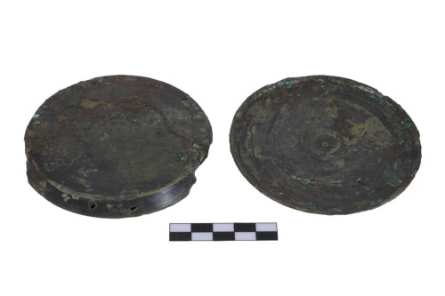 Coperchio di specchio/specchio bivalve: due dischi con bordo rialzato, cerchi concentrici incisi allinterno e umbone centrale. Patina di colore verde scuro.