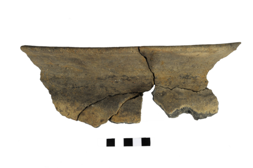 frammento di orlo esoverso con labbro appiattito e assottigliato pertinente ad un vaso biconico di grandi dimensioni; in corrispondenza del collo è presente un cordone liscio; superfici lisciate; impasto grossolano di colore bruno