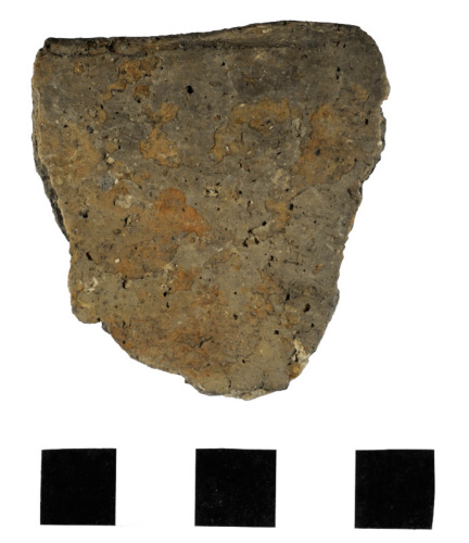 frammento di orlo esoverso con labbro appiattito pertinente a un vaso biconico; superfici levigate impasto grossolano di colore grigio