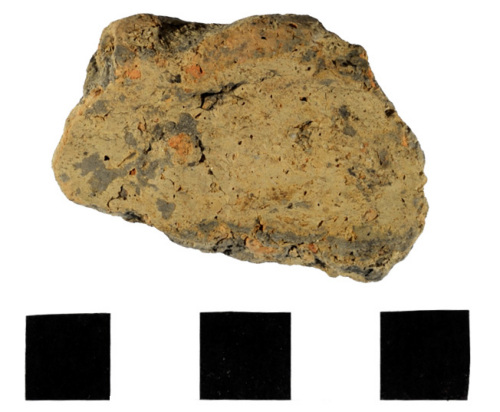frammento di orlo con decorazione a treccia; superfici rozzamente lisciate; impasto grossolano di colore beige