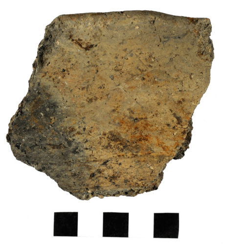 frammento di orlo esoverso con labbro appiattito pertinente ad unolla biconica; sul collo sono presenti due leggere solcature orizzontali; superfici lisciate; impasto grossolano di colore grigio-beige