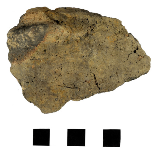 frammento di presa a linguetta triangolare sub-orizzontale, impostata sulla carena e decorata da tacche impresse; superfici rozzamente lisciate; impasto grossolano di colore grigio