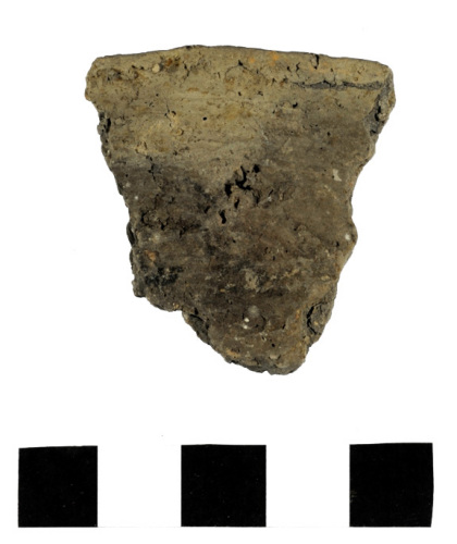 frammento di orlo esoverso rettilineo con labbro appiattito (coperchio?); superfici rozzamente lisciate; impasto grossolano di colore grigio