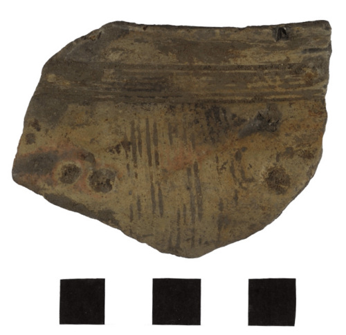 Frammento di tazza biconica: orlo leggermente esoverso e labbro piano, carena arrotondata. La decorazione è costituita da un fascio di leggere solcature disposte sulla spalla e orizzontali rispetto allorlo; al di sotto si diparte un largo fascio di solcature verticali e cuppelle impresse. Le superfici sono levigate, limpasto è fine e di colore grigio chiaro.
