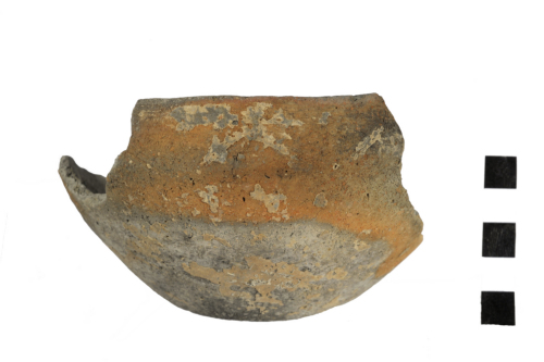 Frammento di coppetta con orlo rientrante e labbro piano e obliquo verso linterno, carena arrotondata e fondo piano a base concava; in corrispondenza dellorlo è presente una fascia orizzontale costituita da leggerissime solcature parallele e, al di sotto, identiche fasce definiscono motivi angolari; le superfici appaiono lisciate ma probabilmente, in origine, erano levigate; limpasto è fine e di colore grigio chiaro.