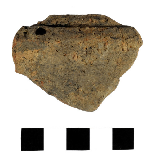 frammento di parete carenata; carena arrotondata in corrispondenza della quale è impostato lattacco di una presa; la decorazione è costituita da una cuppella posta ai lati della presa e da una solcatura orizzontale posta immediatamente al di sopra della carena; superfici lisciate e di colore grigio-marrone; impasto grossolano di colore nero