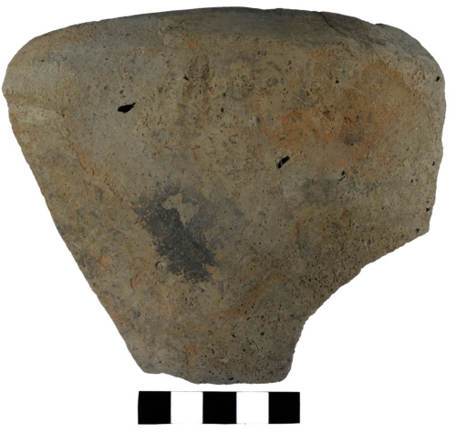 frammento di orlo pertinente ad una scodella con labbro appiattito e inclinato verso linterno; la carena è arrotondata e decorata da costolature elicoidali (decorazione a treccia); vasca arrotondata; superfici levigate di colore grigio; impasto semifine di colore grigio