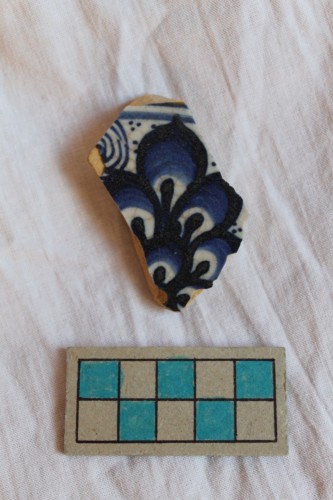 piatto di cui si conserva un frammento di tesa orizzontale sporgente. Sulla superficie interna è presente una palmetta persiana dipinta in blu e azzurro, mentre su quella esterna si sviluppa un motivo "a calza" dipinto in blu, azzurro e arancio.