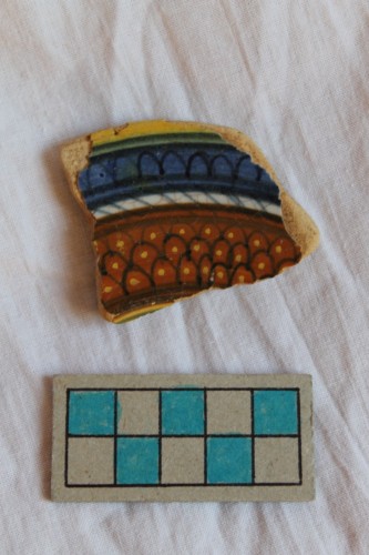 piatto di cui si conserva un frammento di tesa orizzontale sporgente. Sulla superficie interna è presente una cornice blu campita da archetti, seguita da una fascia campita da embricazioni puntate su fondo arancione. Sulla superficie esterna si svolge un motivo "a calza" dipinto in blu e marrone.