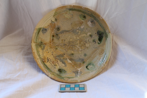 Piattello con piede ad anello leggermente umbonato, vasca a profilo tronco conico, orlo obliquo indistinto e labbro arrotondato. Il manufatto è ingobbiato, graffito e invetriato solo sulla superficie interna mentre è privo di rivestimento sulla superficie esterna. La vasca è definita da una fascia graffita composta da due linee parallele correnti sotto l'orlo, dipinte in verde. Poco sotto si dispongono delle spiralette graffite, alternativamente dipinte in giallo, verde e blu. Al centro del cavetto è, invece, raffigurato un pesce rivolto a sinistra con il corpo campito da squame marcate da pennellate di colore giallo. Il pesce è compreso tra due elementi vegetali graffiti e dipinti in blu, verde e giallo.
