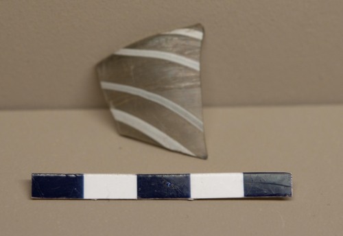 Piccolo frammento di coppa o saliera, con decoro a làttimo (vetro bianco opaco). Il decoro è applicato in modo spiraliforme, partendo dal bordo. Il frammento inquadra un punto del labbro superiore. Il lattimo è costituito da sottilissime canne di vetro reso bianco e opaco dall’introduzione in fase di produzione di stagno.