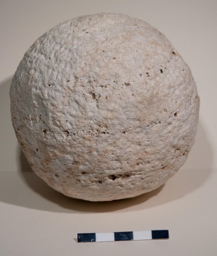 Proiettile, sfera da artiglieria in pietra calcarea bianca, lisciata in superficie e leggermente gradinata. La palla ha un calibro di 11 cm, ed è compatibile con armi da artiglieria leggera da campo quali la colubrina media o il falcone/falconetto, e probabilmente va associata ad una cronologia tra il XV e il XVI secolo. Il calcare sembra essere un calcare veneto, in particolare il Biancone dei vicini Colli Euganei (Padova).