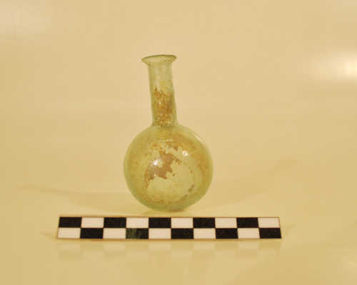 Balsamario con orlo svasato, tagliato e arrotondato, collo cilindrico alto circa la metà dellaltezza totale, sottolineato alla base da una strozzatura, corpo sferoidale, piccola base piana. Diffuso in tutta Italia, ma frequente anche in Gallia e nelle province transalpine. Vetro di colore verdino, trasparente.
