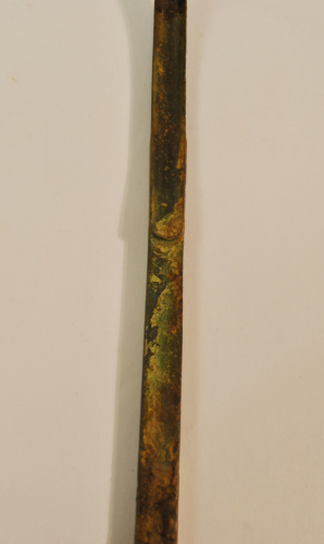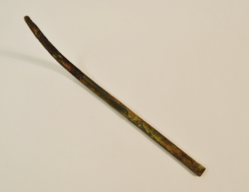Strigile con capulus (manico) parallelepipedo, pieno, liscio, a sezione rettangolare con alette laterali aderenti ai margini della ligula (cucchiaio) e decorato da due linee incise, sui lati lunghi. La ligula presenta allinterno, nel punto di attacco con limpugnatura, una terminazione semicircolare prominente. Sulla faccia interna dellimpugnatura, vicino allattacco con la ligula, due bolli impressi a lati concavi a formare una T e con segni illeggibili all'interno di ciascun bollo, probabile marchio di fabbrica o di proprietà. La ligula è incurvata quasi ad angolo retto, terminante a punta e superiormente decorata da una costolatura centrale e da due leggere laterali. Patina di color marrone.