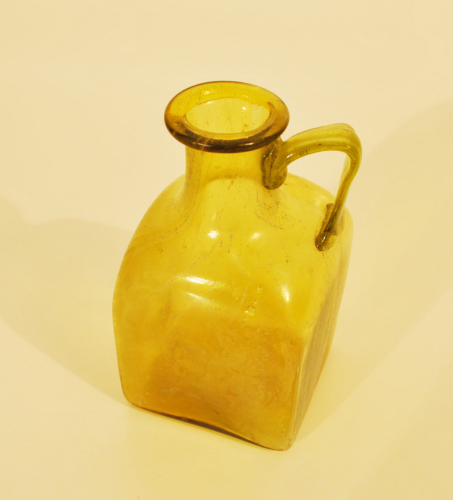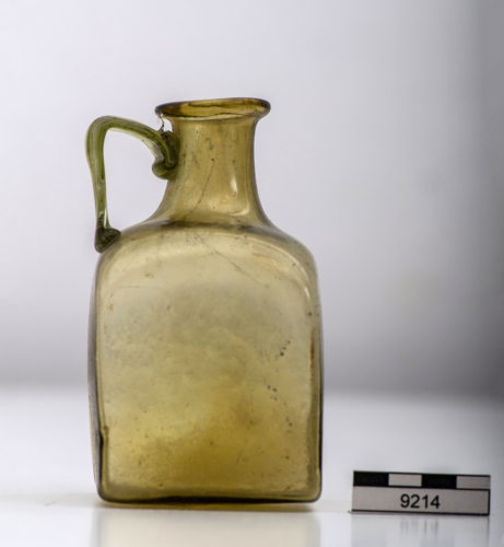 Bottiglia con orlo estroflesso e labbro ribattuto, breve collo cilindrico, ansa a nastro tricostolato, piegata ad angolo acuto, spalla arrotondata, corpo cubico, base piana. Vetro giallo/verde, trasparente. Questo tipo di bottiglia è diffuso in tutta Italia, ma anche in Germania e in Gallia, nel Veneto è diffusa lungo il corso del Po e dei suoi affluenti, lungo il fiume Adige e la vallata del Piave, in particolare nel Veronese, ad Este, ad Adria e in Cadore (cfr. Larese 2004, cit., fig. 26).
