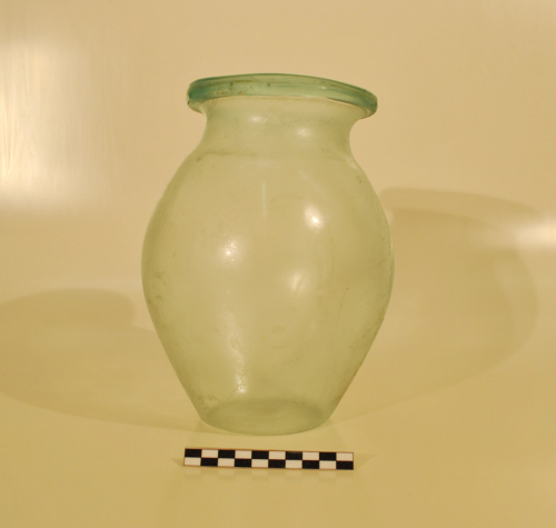 Olla con orlo verticale ribattuto, corpo ovoidale, base concava. Vetro di colore verdino, traslucido.