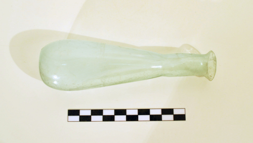 Balsamario con orlo svasato, tagliato e arrotondato, breve collo cilindrico, sottolineato alla base da una strozzatura, corpo tubolare, cilindrico piuttosto allungato, piccola base piana. Tipo di balsamario diffuso in tutta Italia tra letà tiberiana e gli inizi del II sec. d.C., in Veneto vi è una concentrazione soprattutto ad Adria e nel suo territorio, una discreta quantità anche ad Este e a Verona (cfr. Larese 2004, cit., pp. 40-41, fig. 18). Vetro di colore verde-azzurro, trasparente con leggere striature.