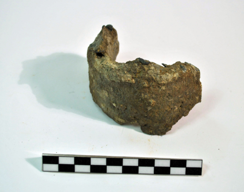 Massiccia lamina di piombo piegata a semicerchio, probabile elemento di tubatura.