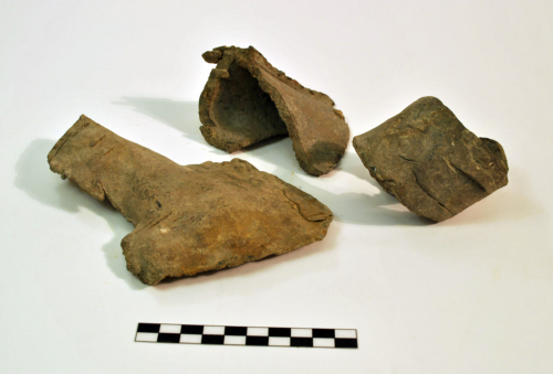 Tre frammenti di spesse lamine di forma irregolare ripiegate.