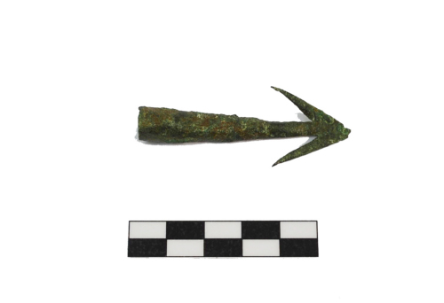 Arpione con corpo a sezione circolare, sfinato e appiattito verso la punta, forma conica, cavo allinterno per linnesto dellasta, punta a freccia con estremità molto appuntite. Patina di colore verde scuro.