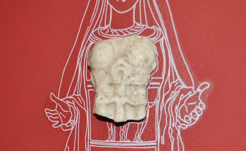 Scheggia di marmo con l'effigie a bassissimo rilievo di un busto femminile. Lungo la frattura superiore del frammento sono scolpite quattro piccole sfere pertinenti ad una collana, in basso due calotte circolari a protezione dei seni, tra le quali è un grande pendente a forma di crescente lunare appeso ad un nastro; al di sotto del pendente e del seno s. è parte di una cintura con solcatura mediana. Questa segna il margine superiore di un fascia nella quale sono scolpite le tre Grazie, conservate solo parzialmente. Marmo bianco a grana molto fine. Si tratta di una replica dell'Afrodite di Afrodisia in Caria raffigurante la dea stante con le braccia piegate e le mani tese in avanti. La figura risulta incorniciata da un velo lungo fino a terra, fermato sul capo da una corona turrita e serrato contro il corpo dai gomiti. Il corpo xoaniforme è coperto da un sottile chitone ed è avvolto da una rigida sopravveste, l'ependytes, sostenuta da una sorta di bretelle, che inizia al di sotto del seno e termina oltre le ginocchia, decorata da fasce orizzontali con figurazioni allegoriche che, nelle varie repliche, si ripetono sempre uguali con variazioni nei particoli e nell'ordine in cui sono disposte (cfr. Fleischer 1973, pp. 167-168, cit.). Secondo le tre tipologie delle fasce figurate, la nostra replica sembrerebbe appartenere al tipo C che presenta tre fasce con le raffigurazioni delle Tre Grazie nella prima fascia in alto, i busti di Selene e di Helios e l'Afrodite Pelagia a cavallo di un mostro marino (cfr. Noelke 1983, pp. 122-123, cit.). Le raffigurazioni dell'ependytes rappresentano allegorie cosmiche riferibili ai regni della natura, Cielo, Mare e Terra, sui quali la dea esercitava il suo potere. (cfr. Bonomi 1994, pp. 457-460 con bib., cit.)