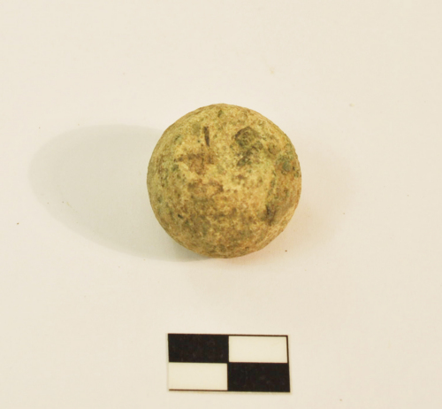 Peso di forma sferica decalottata, con superfici leggermente concave; su quella superiore, due segni a rilievo: una I e un segno di forma romboidale con punto al centro e stanghetta trasversale. Il peso equivale a circa 1 quadrans = 3 oncie = 81 gr con un oncia di 27 gr. Patina di colore verde oliva.