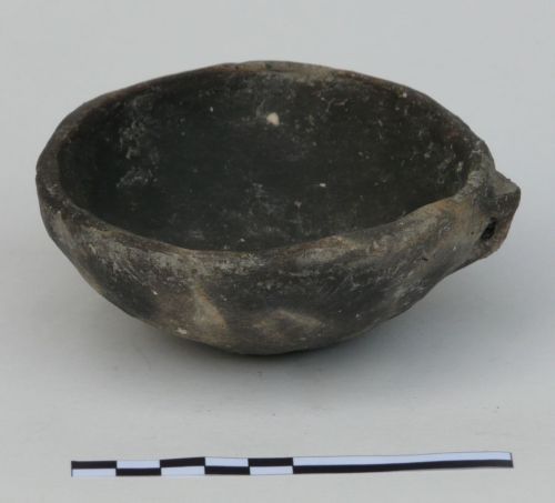 scodella con orlo liscio, vasca a profilo emisferico, piccola ansa canaliculata con accenno di appendice e fondo convesso