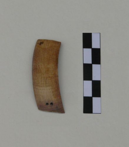 placchetta ornamentale ricavata da difesa di cinghiale, forata (forse in corso di lavorazione perchè mancano i fori nella seconda estremità)