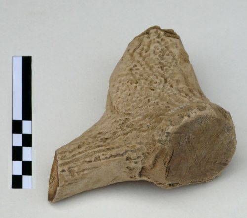 manufatto in corno di grandi dimensioni, con due parti dell'asta e forato alla base, forse interpretabile come zappa