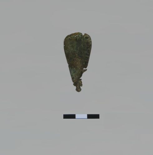 pugnale in bronzo, a base semplice a profilo arrotondato a tre fori, base in continuità con la lama, triangolare corta, a costolatura mediana poco accentuata e sezione romboidale