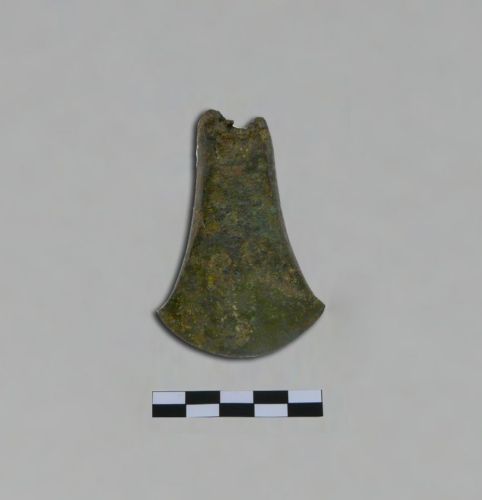 ascia a margini rialzati, di piccole dimensioni e lacunosa nella parte prossimale e del tallone, con taglio arcuato, largo ed espanso