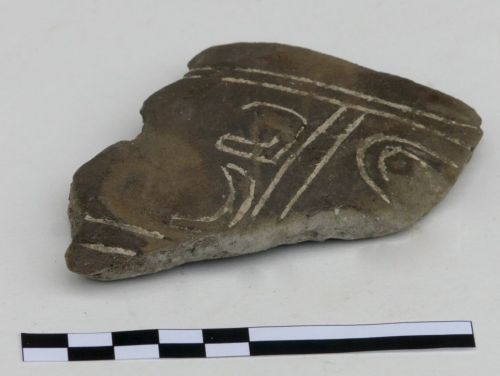 parete decorata da un motivo ad incisione (parte di motivo cruciforme?) campito in pasta bianca