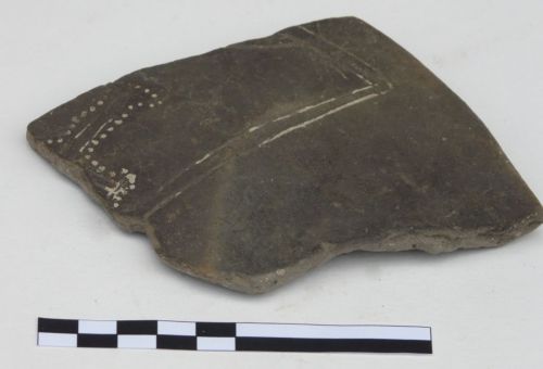 fondo con attacco di carena, probabilmente riferibile ad una scodella articolata, decorato da un motivo a incisioni e punti impressi (cruciforme?)
