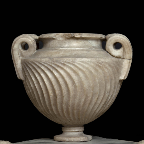 Il vaso, realizzato in marmo, presenta un piede articolato in due tondini, su cui si imposta un corpo decorato da una sinuosa strigilatura e dalla forma emisferica. Esso si interrompe appena sotto la spalla, laddove si impostano due anse a sezione esagonale che, a ridosso dell'orlo, si ripiegano ad anello. La stessa spalla è costituita da una gola e da un listello lisci su cui si posa un collo corto, che sorregge un orlo svasato.