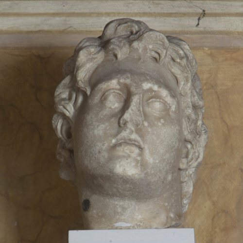 La testa è inclinata lievemente indietro e sollevata verso l'alto. Il volto possiede un ovale morbido, in cui però si coglie l'impalcatura ossea sottostante. Esso è definito da una fronte stretta da cui emergono le arcate soppraccigliari appena rilevate e notevolmente profonde, che ombreggiano occhi piccoli, sollevati verso l'alto. Il naso presenta una forte lacuna, ma doveva essere diritto e regolare. La bocca, dalle labbra socchiuse, assume espressione seria quasi trasognata. L'acconciatura è costituita da lunghe ciocche ondulate che si dispongono attorno al viso, scomposte e ribelli.
