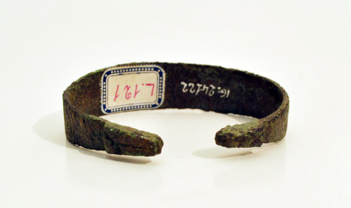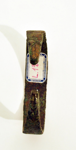Armilla di forma ovale, verga ampia e piatta, a sezione rettangolare con capi aperti, estremità ingossate, appuntite e di forma trapezoidale sulle quali è incisa una X e una linea orizzontale. La verga è decorata superiormente, nella parte centrale, con tre file orizzontali e parallele di trattini incisi, paralleli e verticali, terminante su un lato con due file verticali e parallele di trattini incisi trasversali e paralleli, mentre sulle due parti laterali sono tratti incisi trasversalmente. Confronti per questo tipo di monile, variante della famiglia delle armille a testa di serpe, sono stati rinvenuti in Trentino Alto Adige, nel Veneto, nel Friuli, in Austria, in Ungheria e in Baviera. Veniva indossato da donne di costume tardo romano e rinvenuto nelle tombe. Patina di colore marrone.