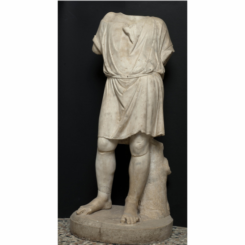 La scultura è acefala, per di più priva di parte del braccio sinistro e del destro. Ritrae un giovane, il cui peso poggia sulla gamba sinistra, sorretta anche da un trochetto, mentre l'altra si flette ad aprire il piede verso l'esterno. Indossa un'exomis corta e aderente, che arriva a lambire appena le ginocchia ed è trattenuta in vita da una cintura di stoffa. Il retro della scultura è stato rilavorato per rendere il volume del corpo, laddove in origine esso si univa al fondale di un altorilievo.