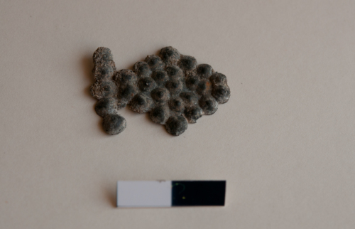 Borchia a forma di losanga o diamante. La borchia è ottenuta giustapponendo e saldando insieme piccoli umboncini metallici (mezze sfere) in un unico oggetto. Ai lati vi sono due elementi verticali realizzati con la stessa tecnica, utilizzati per fissare la borchia con del filo a un supporto probabilmente di stoffa. Si tratta di un tipo di borchia decorativa che può essere stato utilizzato per la decorazione di una borsa o anche di altri accessori da abbigliamento, anche legati al pellegrinaggio.