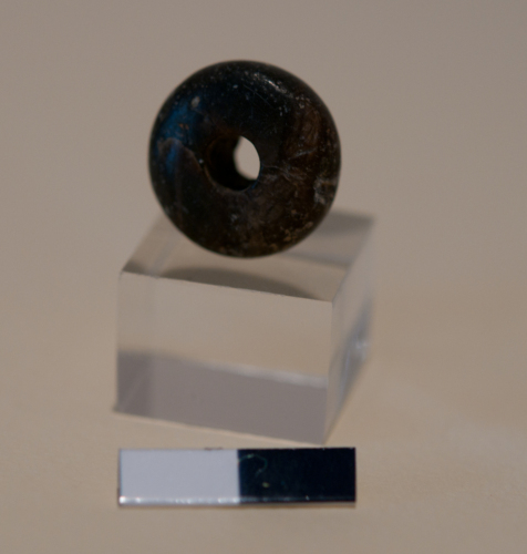 Vago di collana (rosario) in pasta vitrea bruno scura. Il vago è di forma circolare e a sezione ovoidale.