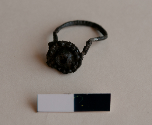 Piccolo anello con castone in lega di rame. La fascia è ottenuta da un tubetto circolare ripiegato su se stesso, decorato da punzonature, e chiuso da un piccolo castone, ottenuto da un dischetto ripiegato fino a ottenere lincavo per una piccola perla (probabilmente vitrea) decorato da una corona ghiera segnata da punzonature (circa 20). La perla o la pietra oggi è mancante.