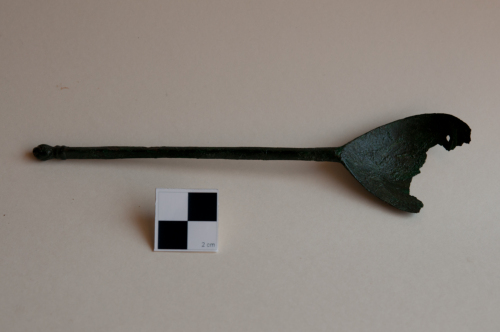 Cucchiaio in lega di rame, con manico a sezione quadrata, decorato da una pigna finale nellimmanicatura, preceduta da un doppio anellino.