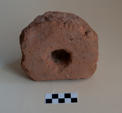 Peso da rete ricavato da laterizio ri-lavorato, probabilmente un sesquipedale recuperato di epoca romana, spaccandolo a metà, creando un foro, e smussando la parte superiore per rendere più ergonomico il peso. Si notano i segni di passaggio di una corda sottile nel foro.